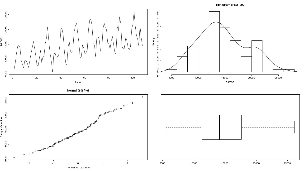 Enter the data in R system using JGR as R GUI or using RClass. # To predict anything, you have to get the data SALES <- scan(); 6550 8728 12026 14395 14587 13791 9498 8251 7049 9545 9364 8456 7237 9374 11837 13784 15926 13821 11143 7975 7610 10015 12759 8816 10677 10947 15200 17010 20900 16205 12143 8997 5568 11474 12256 10583 10862 10965 14405 20379 20128 17816 12268 8642 7962 13932 15936 12628 12267 12470 18944 21259 22015 18581 15175 10306 10792 14752 13754 11738 12181 12965 19990 23125 23541 21247 15189 14767 10895 17130 17697 16611 12674 12760 20249 22135 20677 19933 15388 15113 13401 16135 17562 14720 12225 11608 20985 19692 24081 22114 14220 13434 13598 17187 16119 13713 13210 14251 20139 21725 26099 21084 18024 16722 14385 21342 17180 14577 LOAD_LIBRARIES(); JAB.PREDICTION.EDA(SALES); JAB.PREDICTION.EDA_TABLE(SALES); JAB.PREDICTION.NORMAL_TESTS(SALES);